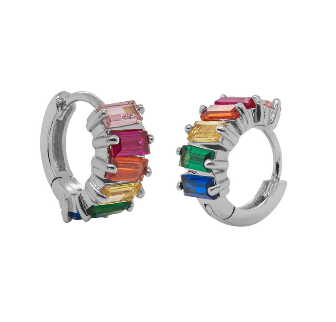 These delicate rainbow earrings offer a fun way to celebrate PRIDE. Set with an array of sparkling, rainbow-colored stones, these rainbow huggies are a beautiful way to celebrate your love.